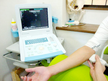 超音波画像観察装置を用いて患者様と状態を確認し、各種物理療法、手技療法、